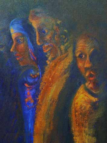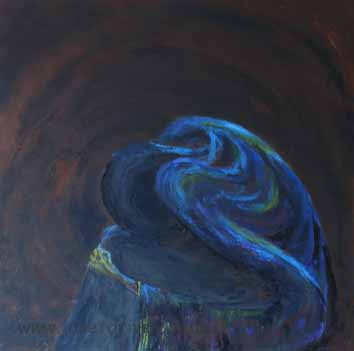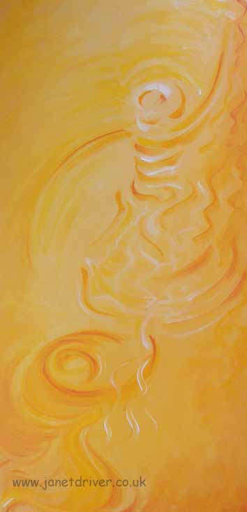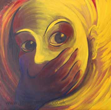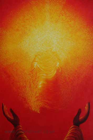 Over the years since studying Theology I have often puzzled over our Greek tutor's comment that "Rabbouni" was a word hardly ever used except in Jewish prayers, when addressing God. So perhaps Mary had a profound experience of the glory of God in her recognition of the Risen Christ. How, then, could this be expressed in a painting? It clearly needed to be a very joyful painting, but just then I was going through a time of grief and darkness. Surely this painting would have to wait... I waited for several months before finally I felt the time had come to make the attempt. The amazing thing was that it gradually grew as it was painted. I began by experimenting with several layers of red and yellow, hoping to achieve a rich glowing light from which a figure might emerge and yet also remain hidden. Then the foreground hands were painted almost life-size in the hope that the viewer would feel drawn into the picture. I hoped those raised hands might invite a response, an interaction, an empathy with the experience of Mary of Magdala as she recognizes the Risen Christ. I tried to show a sense of the wonder and awe that I imagine she felt... of Jesus coming towards her, raising his hands in joyful response to her recognition of who he is. And above all, I hoped to paint it in such a way that the viewer would be drawn right into the picture, to share in her joy. | |