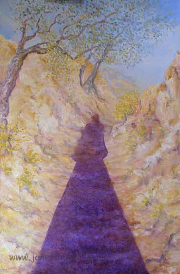 "...Go and tell..." Having puzzled for some time over how to paint this, the idea came to me whilst walking very early one morning, just as the sun was rising. I was surprised how long my shadow was as it stretched way out in front of me along the narrow pathway... and suddenly I could almost "see" Mary of Magdala setting out, back to wherever the disciples were hiding, with the light of Christ behind her, illuminating her path... In this painting we are invited to take this journey of Mary of Magdala as a symbol for our own journey through life, with the light of Christ illuminating the way ahead.... |